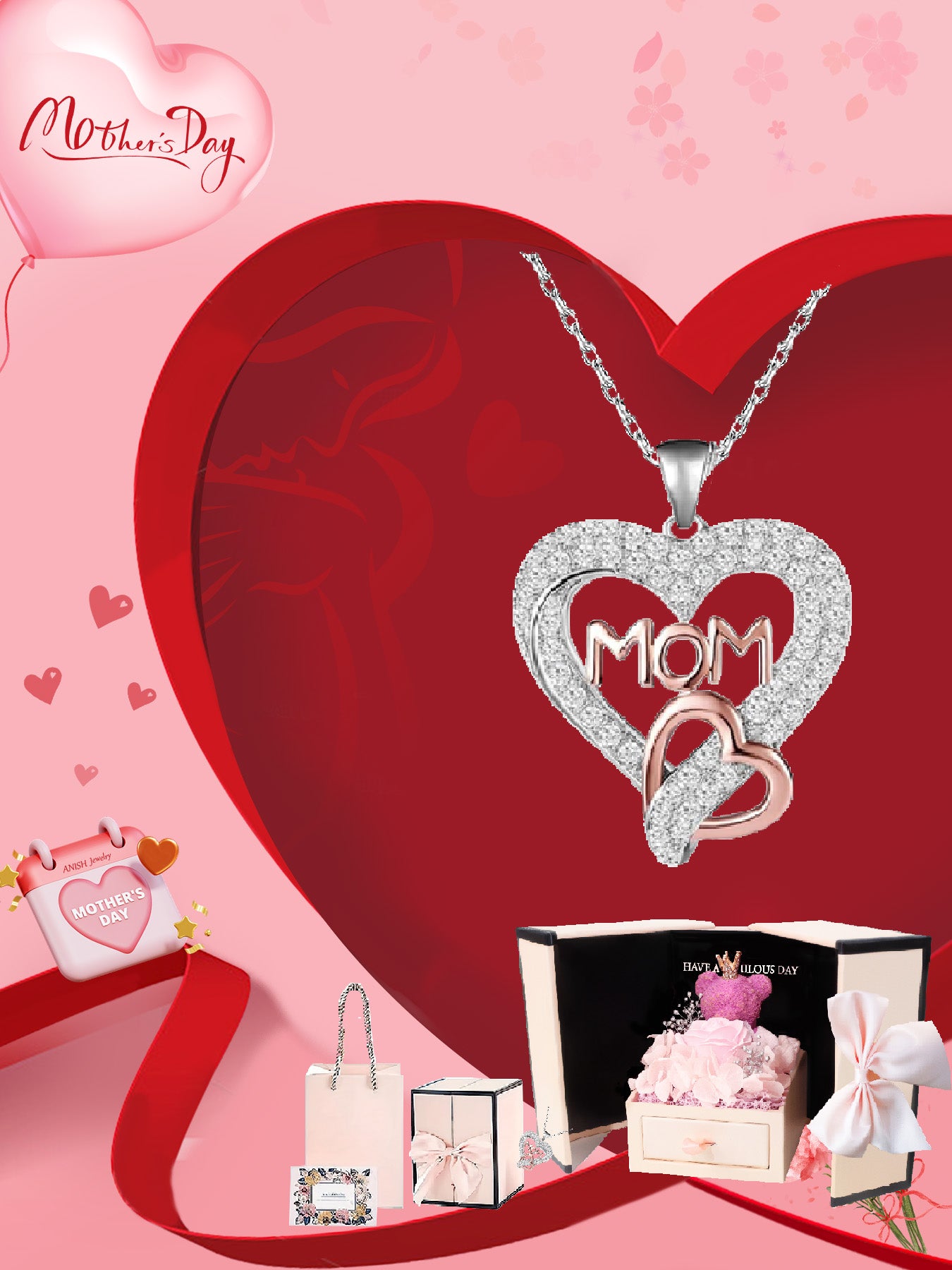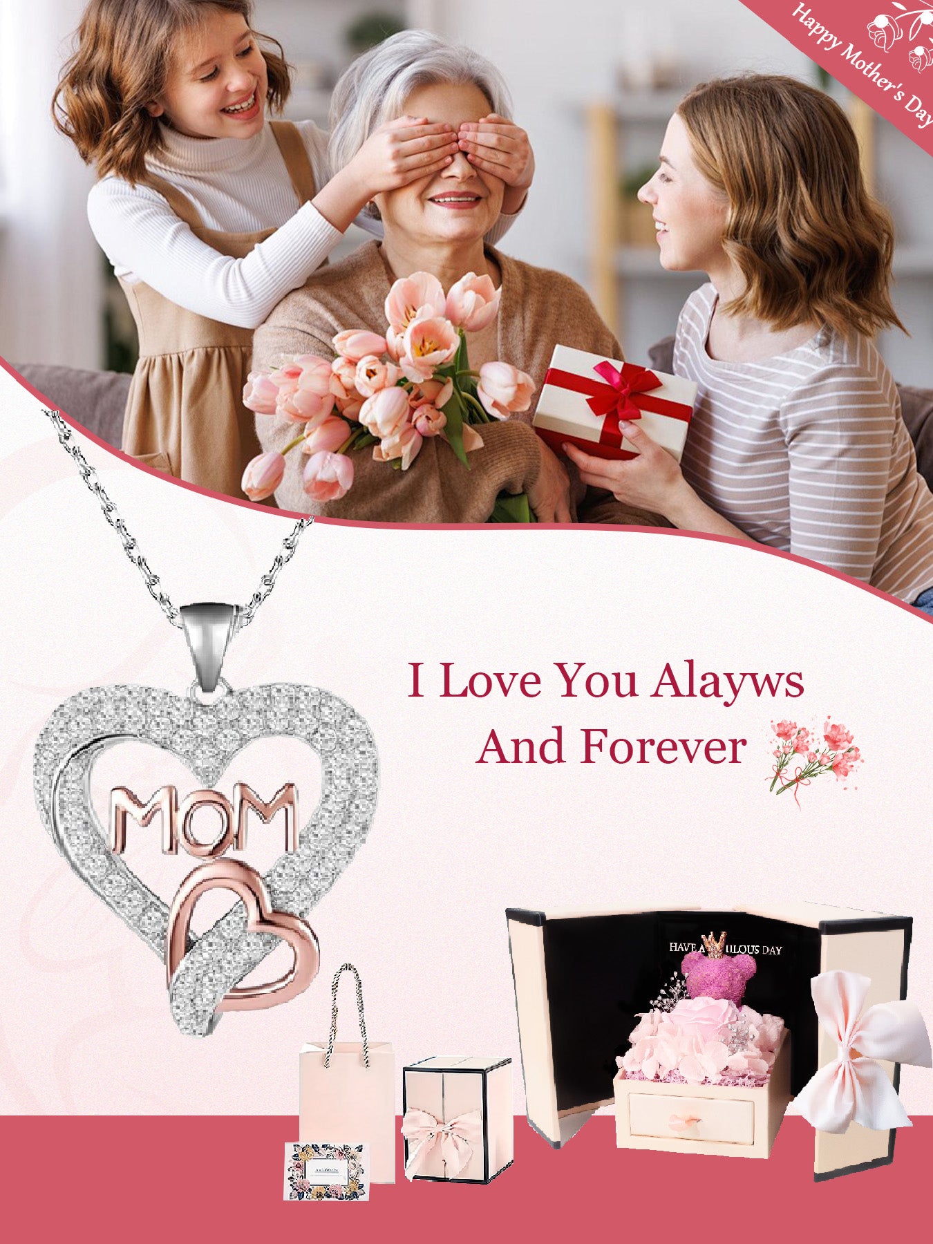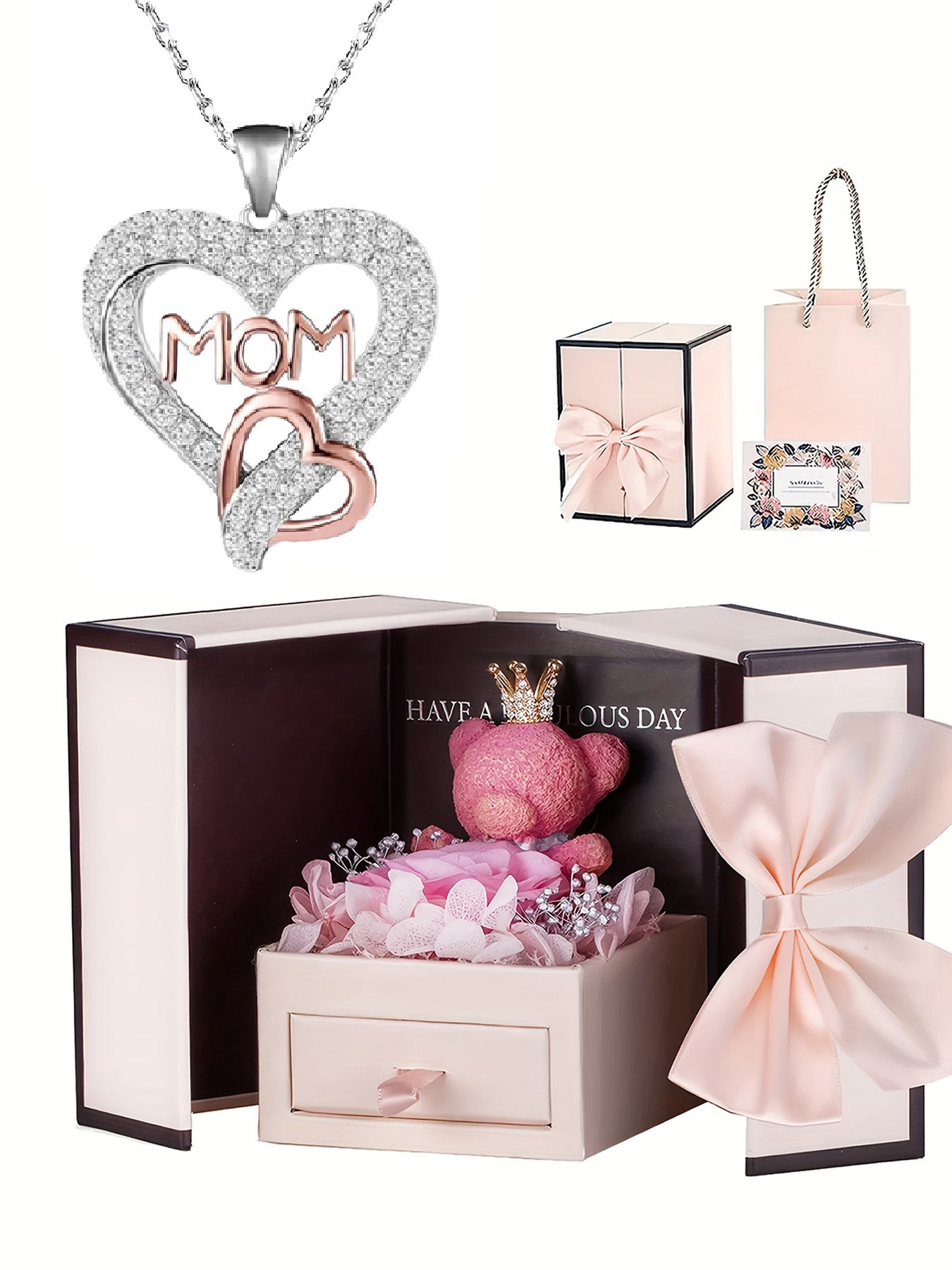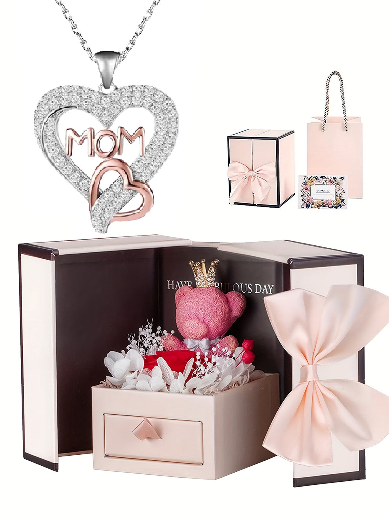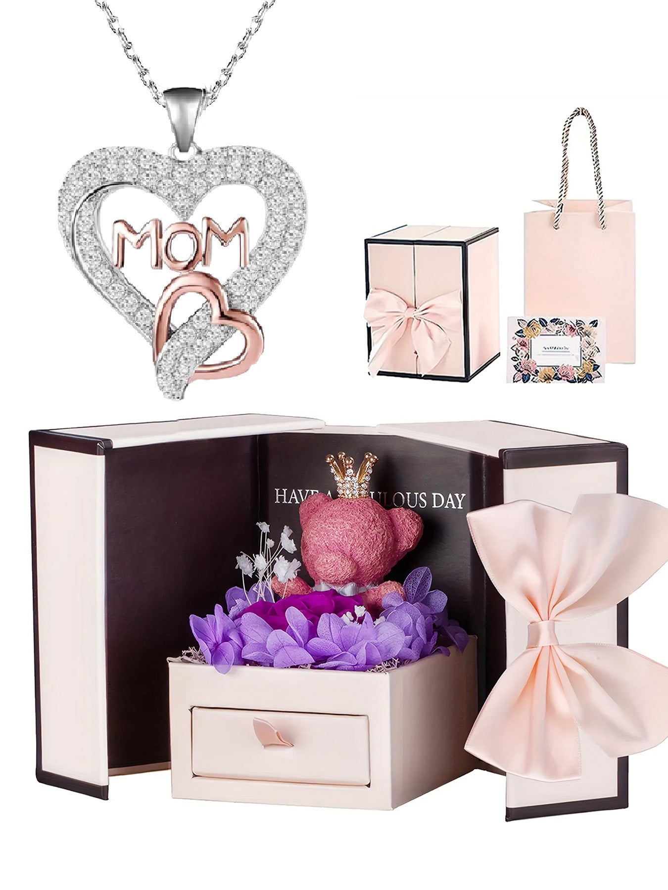 【Unique Gift for Mom】Rose Box is a combination of rose box and pink bear, paired with a heart-shaped zircon necklace. This is a warm gift for mom, wife and girlfriend.