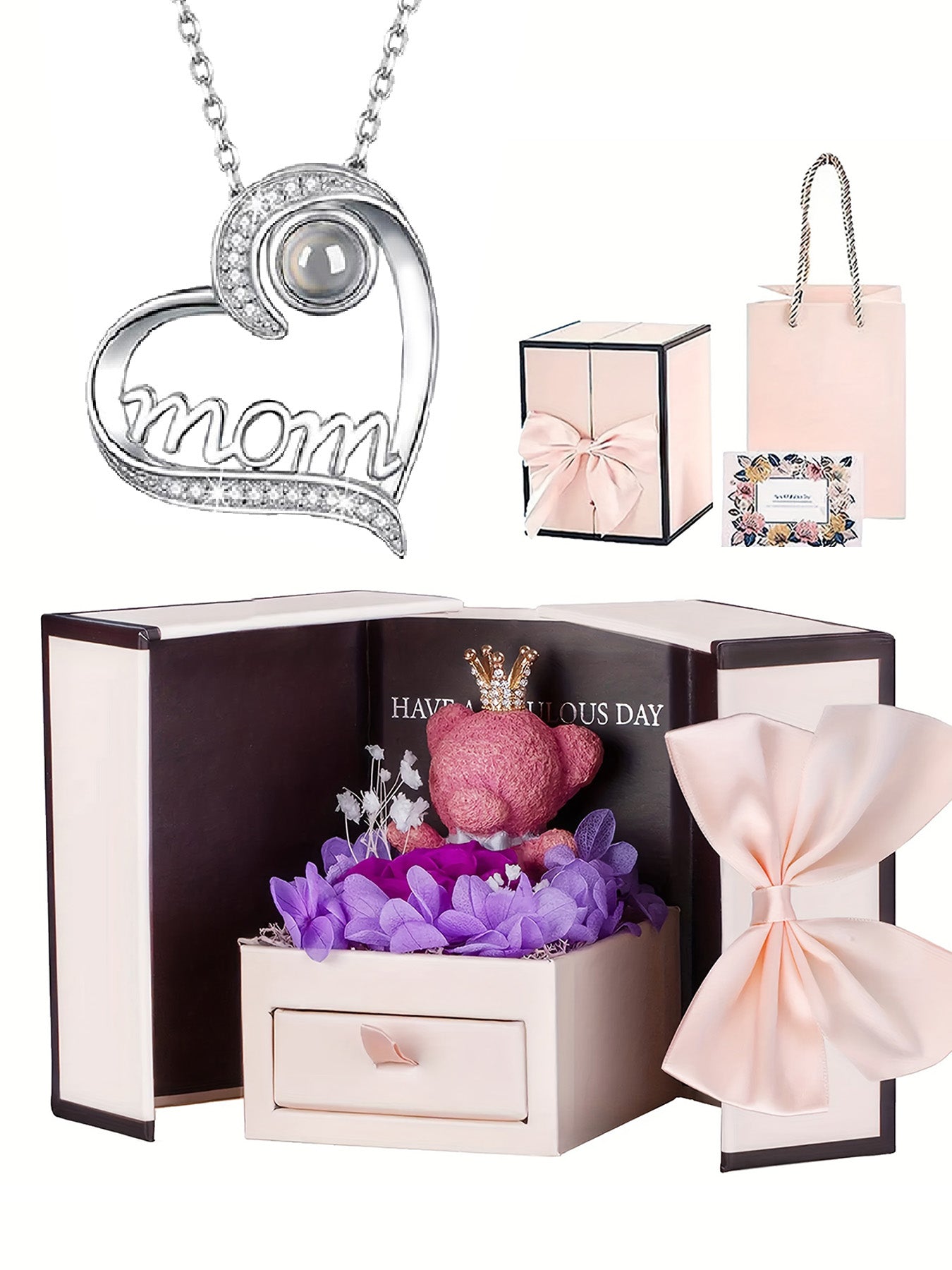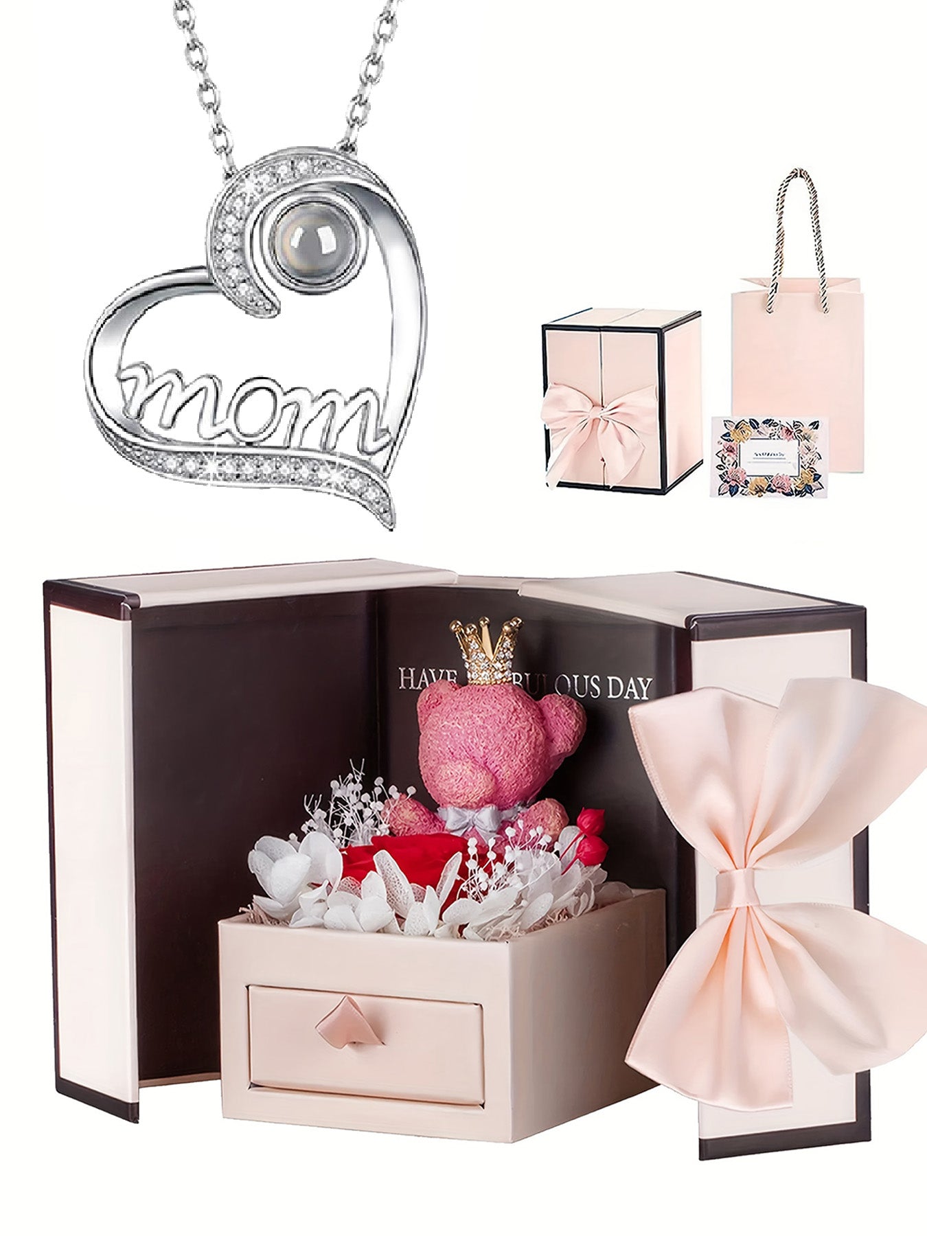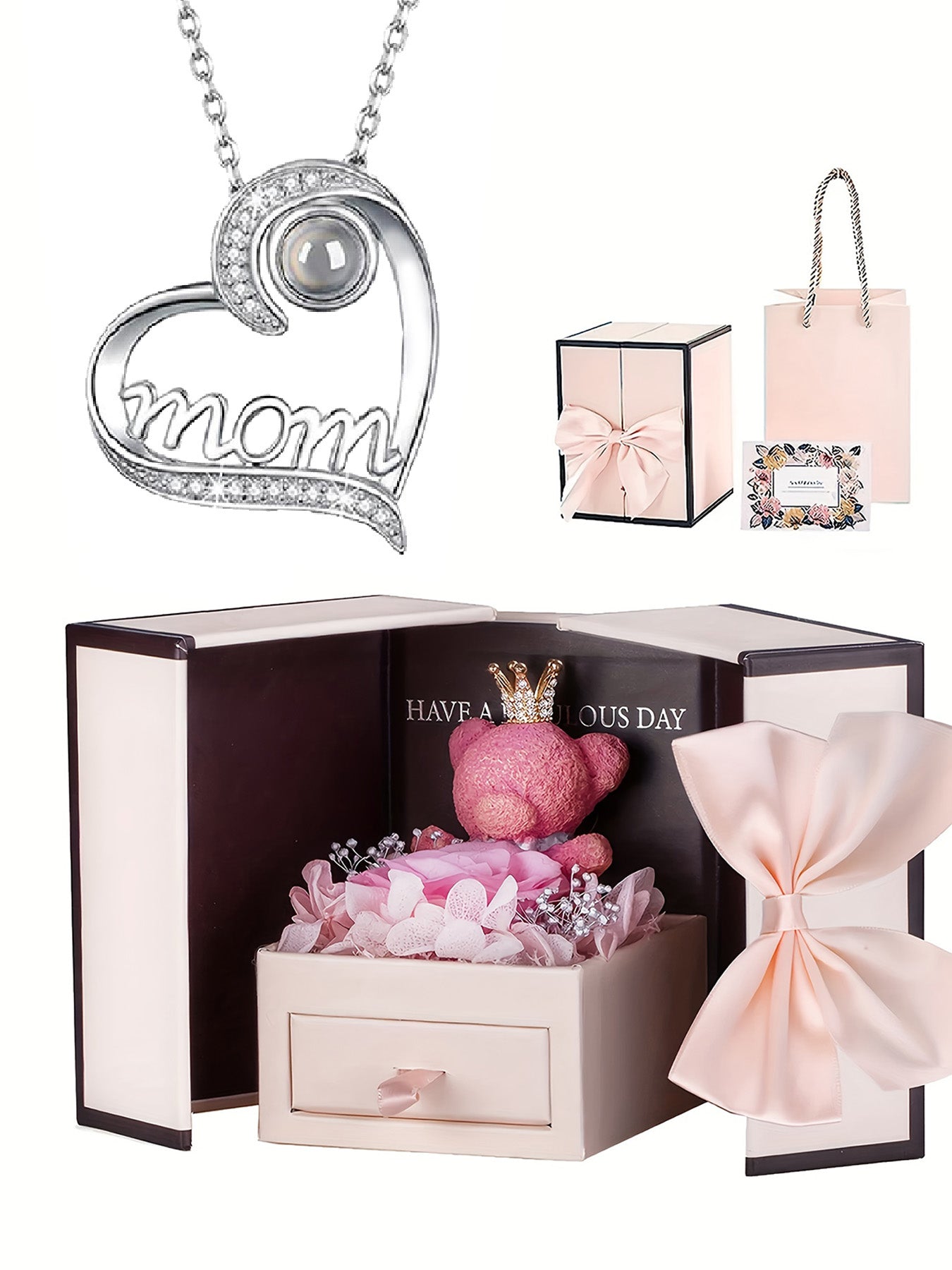 Love projection necklace in one hundred languages with bear rose gift box, women's mother mother and daughter necklace, Mother's Day gift, holiday gift for mother and grandmother, anniversary gift, gift for wife, Mother's Day gift for mother, birthday g